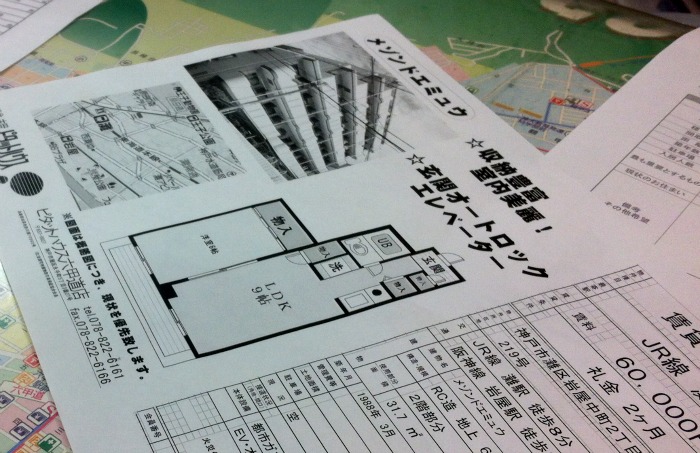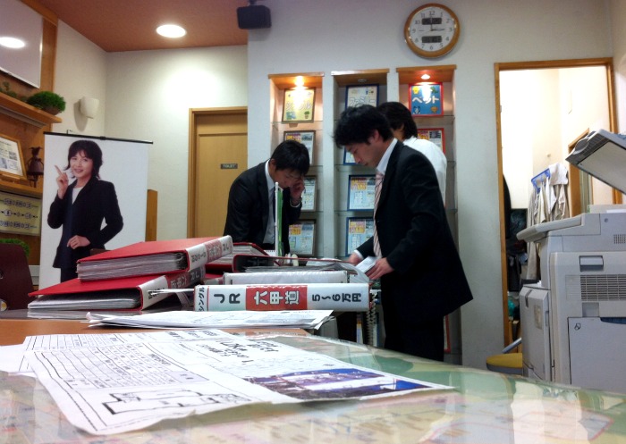 El agente de la inmobiliaria, amable pero sin pasarse, empieza a sacarnos papeles de los diferentes pisos, con sus planos (incluyendo el número de tatamis o metros cuadrados y las habitaciones disponibles), condiciones económicas y situación geográfica. Elegimos 5 o 6, que nos gustan especialmente por la zona o por el precio y al poco rato estamos subidos en el coche conducido por otro agente, mucho más joven que el anterior.