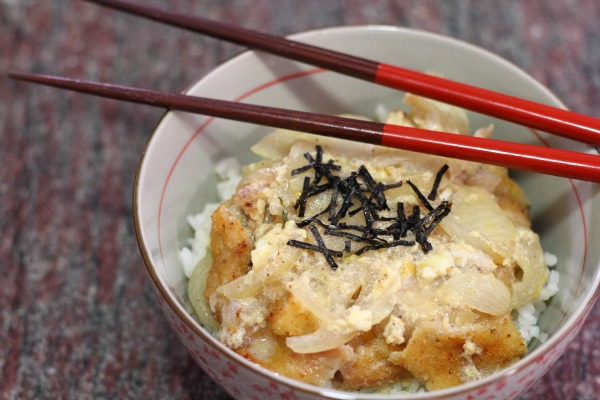 El katsudon カツ丼 es un popular plato japonés consistente en un bol de arroz cubierto por una chuleta de cerdo rebozada, huevo revuelto y una salsa especial que varía según la región (Worcestershire, salsa de soja, miso…).